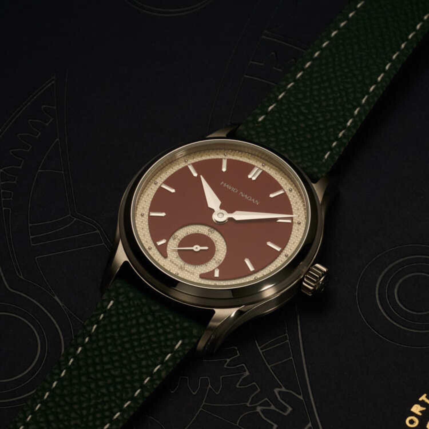 The hand-wound Sellita SW210-1 movement, visible through the sapphire caseback, is finely decorated and offers a 42-hour power reserve. Housed in a polished 39mm stainless steel case with twisted lugs and 100m water resistance, it’s finished with a hand-stitched leather strap.